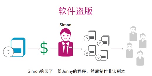 下圖顯示了一個簡單的軟件盜版情境。某人購買了一個許可證以使用你的某個軟件程序制作多個副本,然后進行非法共享或銷售給他人。