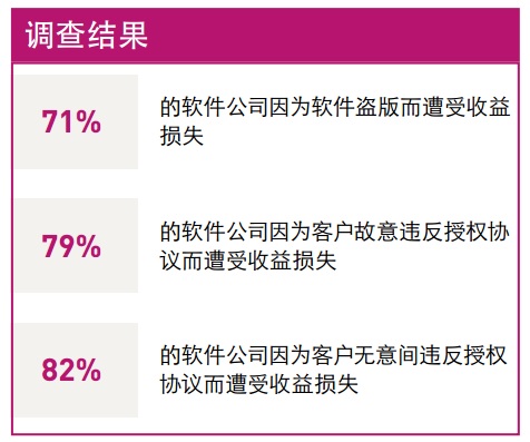 很明顯,軟件出版商的業務受到了影響,因為這些受訪者中有71%表示他們因為軟件盜版遭受了收益損失。此外,有79%表示他們因為客戶故意違反授權協議而遭受收益損失。而82%的受訪者報告,還有因為客戶無意間違反授權協議而遭受的收益損失。