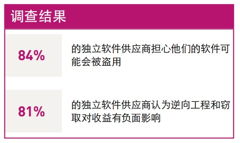 多數典型軟件公司或智能設備制造公司的市場價值。相應地,由于公司在爭取業務方面變得更加積極,競爭壓力也會自然增加。競爭性的偵查活動越來越普遍,而您寶貴的軟件知識產權(包含代碼、算法、應用程序數據文件和商業機密)均處在窺探視線、逆向工程、竊取以及競爭對手進行偽造剽竊的風險之中。毫無疑問,逆向工程和竊取商業機密會對軟件出版商造成負面影響。在最近的一次調查中,全球獨立軟件開發商受訪者中有壓倒性的84%報告稱他們擔心自己的軟件可能會被盜用。81%的人認為逆向工程和竊取正在耗掉他們的收益。