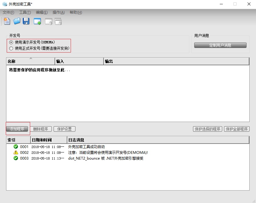 2、直接將被加密文件拖拽至加密框,或者從“添加文件”中選擇被加密的文件。左上角選擇演示開發(fā)號或正式開發(fā)號。
