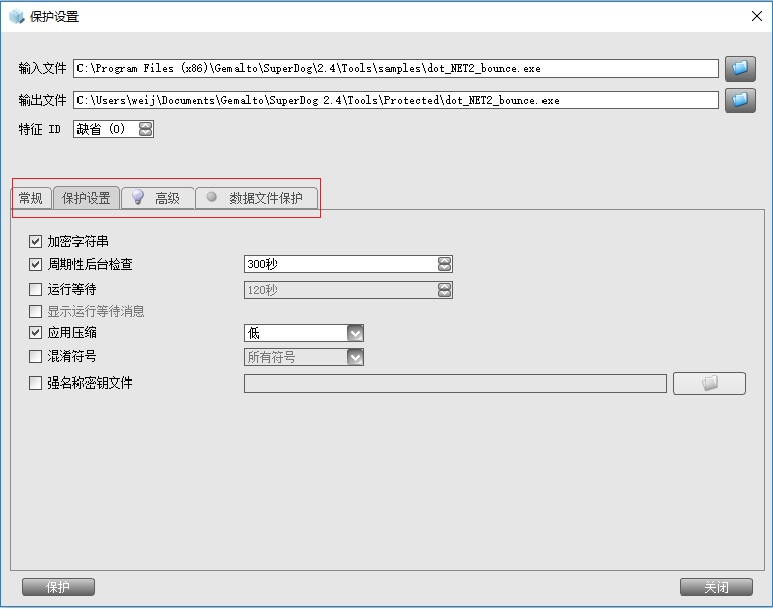 其中“周期性后臺(tái)檢查”設(shè)置加密后的程序后臺(tái)默認(rèn)檢查加密狗的頻率,即拔掉后程序反應(yīng)的時(shí)間。
