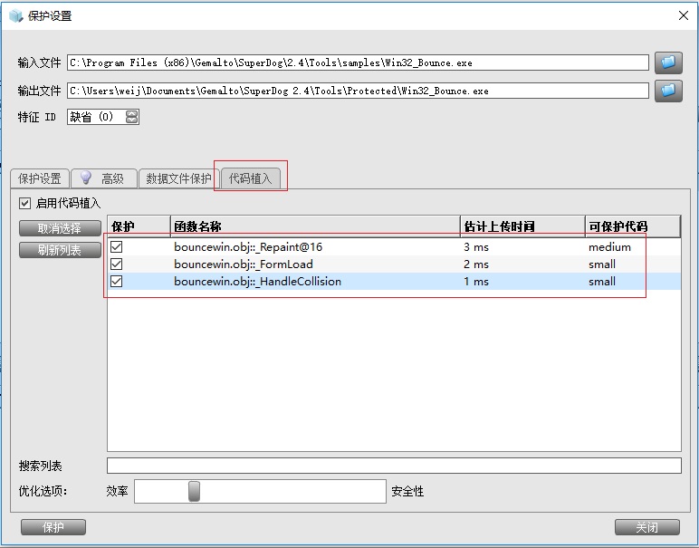 將被加密程序和map文件放同一目錄,加密時(shí)在“代碼植入”選項(xiàng)中選擇可以支持在加密狗中運(yùn)行的代碼。該部分代碼在加密后不會(huì)直接在電腦中運(yùn)行,而是通過加密狗運(yùn)行并向程序返回運(yùn)行結(jié)果。哪些代碼可以在加密狗中運(yùn)行由加密工具自動(dòng)判斷,函數(shù)代碼太短可能無法被加密工具識(shí)別,太長可能會(huì)影響運(yùn)行效率,具體根據(jù)實(shí)際程序代碼情況需要多次測試。使用代碼植入功能需要包含map文件,點(diǎn)擊此處查看如何生成map文件->>>>>>>