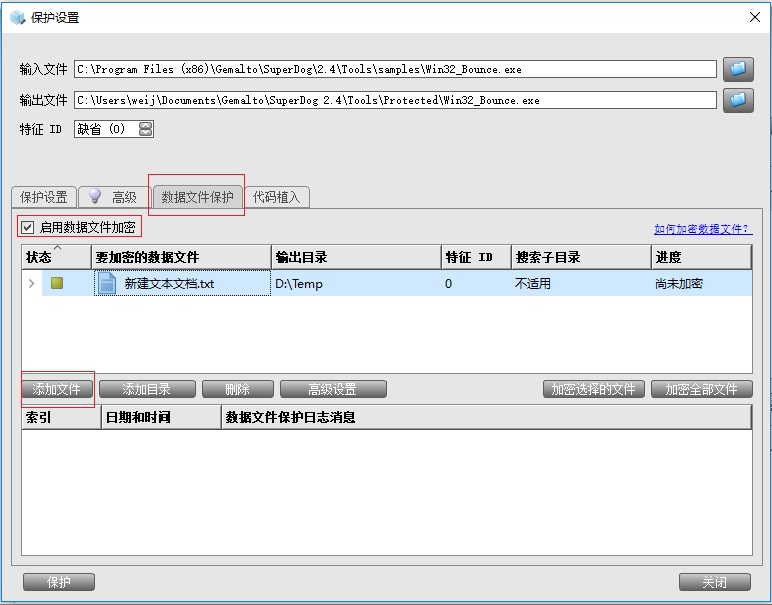 某個(gè)視頻文件要加密、程序中調(diào)用的數(shù)據(jù)文件不想被看到、或者一些exe / dll以外的程序運(yùn)行時(shí)需要加密狗的驗(yàn)證,就可以使用數(shù)據(jù)文件功能。