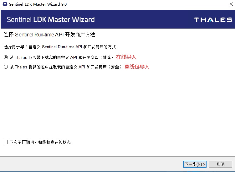 默認(rèn)是從Thales網(wǎng)站下載,如果不能聯(lián)網(wǎng)或者下載過(guò)程中報(bào)錯(cuò), 可選擇從Thales經(jīng)銷商提供的離線包中提取。離線包可向經(jīng)銷商申請(qǐng),一般需要一個(gè)工作日。
